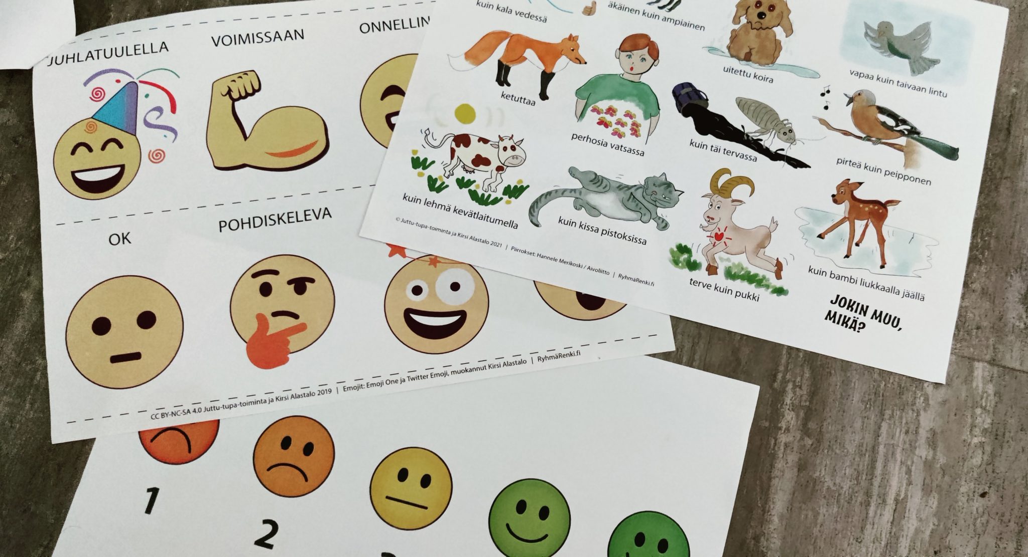 Kolme a4 paperia, joilla on kuvia omien tunteiden kertomisen tueksi. Kuvissa on hymiöitä eri ilmein sekä eläimiä. Niina ohjaa kuopiolaisen Juttu-tuvan afaattisia henkilöitä ja tukee kommunikointia sitä tukevilla menetelmiä kuten kuvilla. Kuva Niina Naumanen,