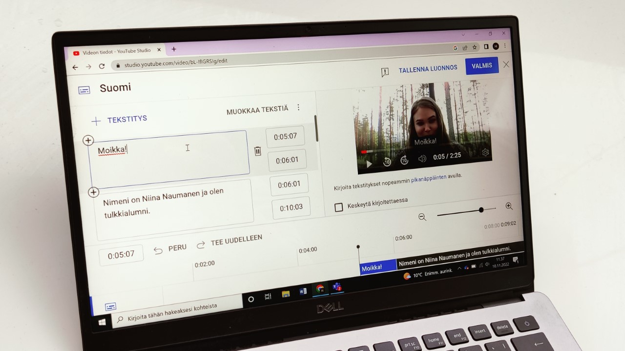 Tietokoneen ruudulla on auki YouTuben tekstitystyökalu. Videon tekstit tulevat omiin ruutuihin lause lauseelta. Harjoittelu sisälsi paljon videoiden tekstittämistä sekä tutustumista erilaisiin ohjelmiin ja puheentunnistustyökaluihin, joita tekstittämisen apuna käytetään. Kuva: Niina Naumanen.