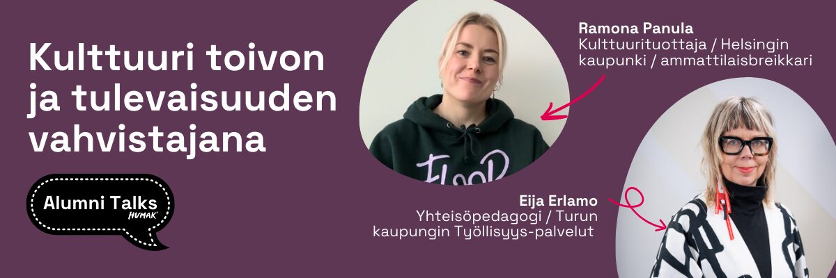 Alumni Talksin teemana marraskuussa 2025 oli kulttuuri toivon ja tulevaisuuden vahvistajana. Alustajina toimivat kulttuurituottaja Ramona Panula, joka työskentelee Helsingin kaupungilla sekä on pitkänlinjan ammattilaisbreikkari. Toisena puhuja oli Eija Erlamo, joka on valmistunut yhteisöpedagogiksi ja toimii Turun kaupungin työllisyyspalveluissa.