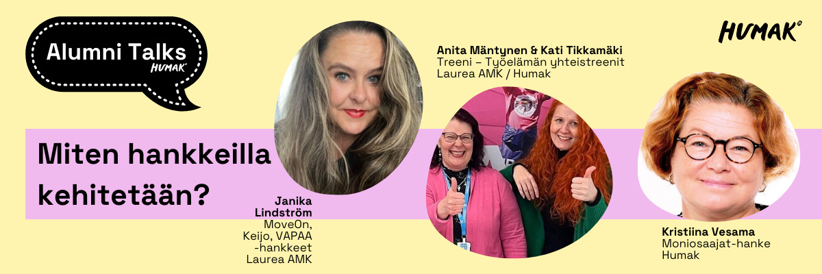 Alumni Talks -verkkotilaisuus järjestetään kolme kertaa vuodessa. Aiheet valitaan kaikkia Humakista valmistuneita kiinnostavista teemoista. Hanke-teema soveltui mainiosti ammatilliseksi kehittymiseksi ja alumnien verkostoitumiseen.