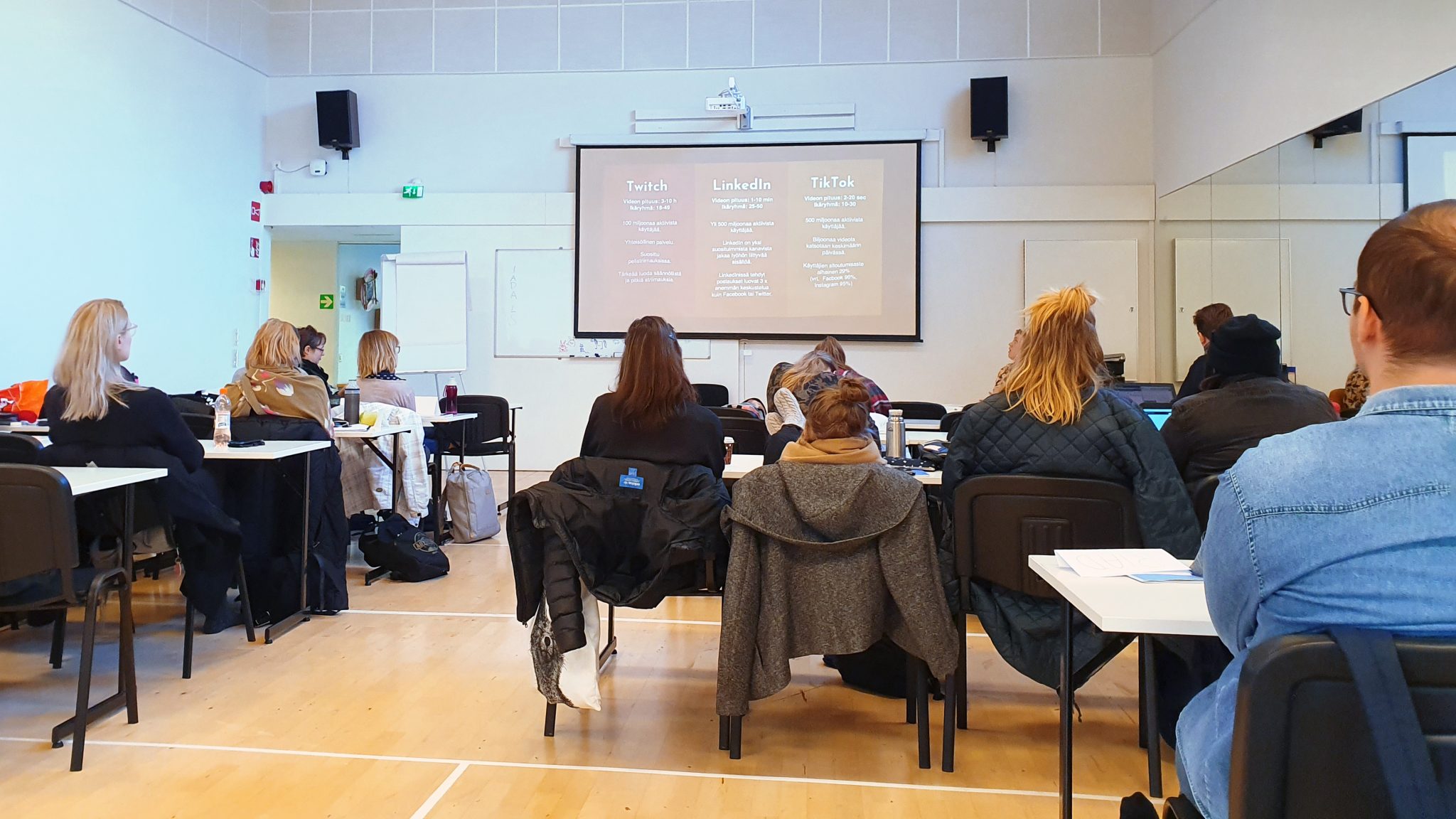 Opiskelijat istuvat selkäpäin kameraan oppitunnilla ja kuuntelevat puhujaa.