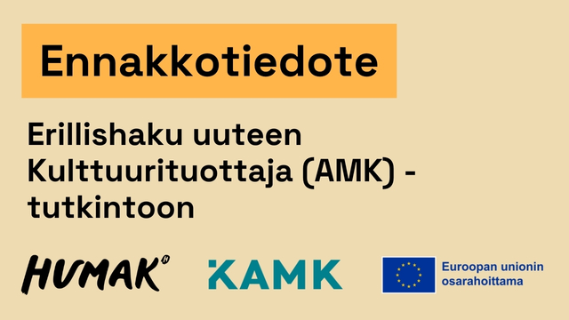 Kulttuurituottaja (AMK) -tutkintokoulutus käynnistyy erillishaun kautta syksyllä 2026. Koulutukseen valitaan 30 opiskelijaa, ja se toteutetaan monimuoto-opetuksena Humakin kulttuurituotannon ja KAMKin pelialan yhteistyönä.