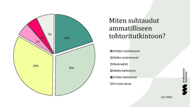 Peräti puolet yritysten edustajista kertoo suhtautuvansa ammatilliseen tohtoritutkintoon erittäin tai melko myönteisesti. 40 prosenttia suhtautui neutraalisti tai ei osannut sanoa, ja kielteisesti suhtautui ainoastaan 9 prosenttia. Tämä käy ilmi ammattikorkeakoulujen ryhmittymän teettämästä yrityspäättäjäkyselystä.