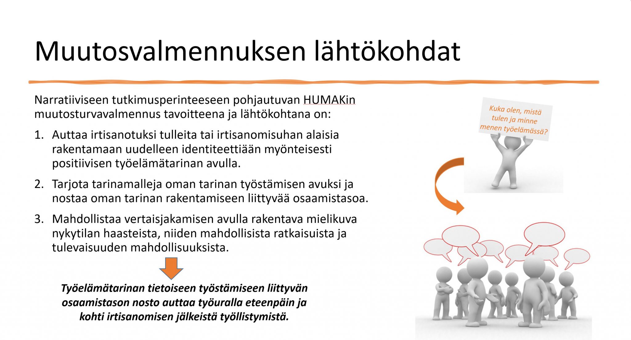 Valmennus perustuu tarinalliseen lähestymistapaan, tarkemmin tarinallisen kiertokulun teoriaan ja oman työelämätarinan muokkaamiseen osana identiteetin uudelleen rakentamisen prosessia irtisanotuksi joutumisen jälkeen. Valmennuksen aikana osallistuja pohtii omaa työhistoriaansa ja työuransa tulevaisuutta sekä työstää näistä muodostuvaa työelämäntarinaansa yhdessä vertaisryhmän ja valmentajien kanssa.