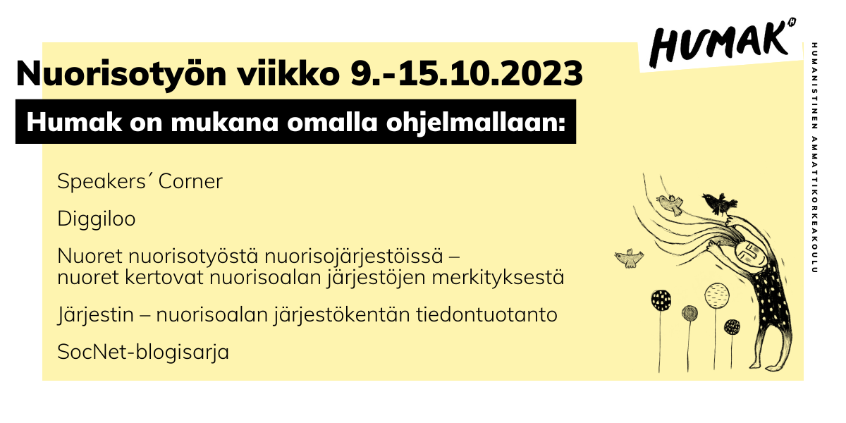 ”Nuorisotyön viikko tuo näkyvyyttä koko nuorisotyön kentälle ja kiinnittää huomiota nuorisotyön merkityksellisyyteen nyky-yhteiskunnassa. Humakille nuorisotyön viikko on mahdollisuus juhlistaa nuorisotyön osaamista ja koulutusta sekä kokea yhteisöllisyyttä nuorisoalalla,” kertoo yliopettaja Merja Kylmäkoski.
