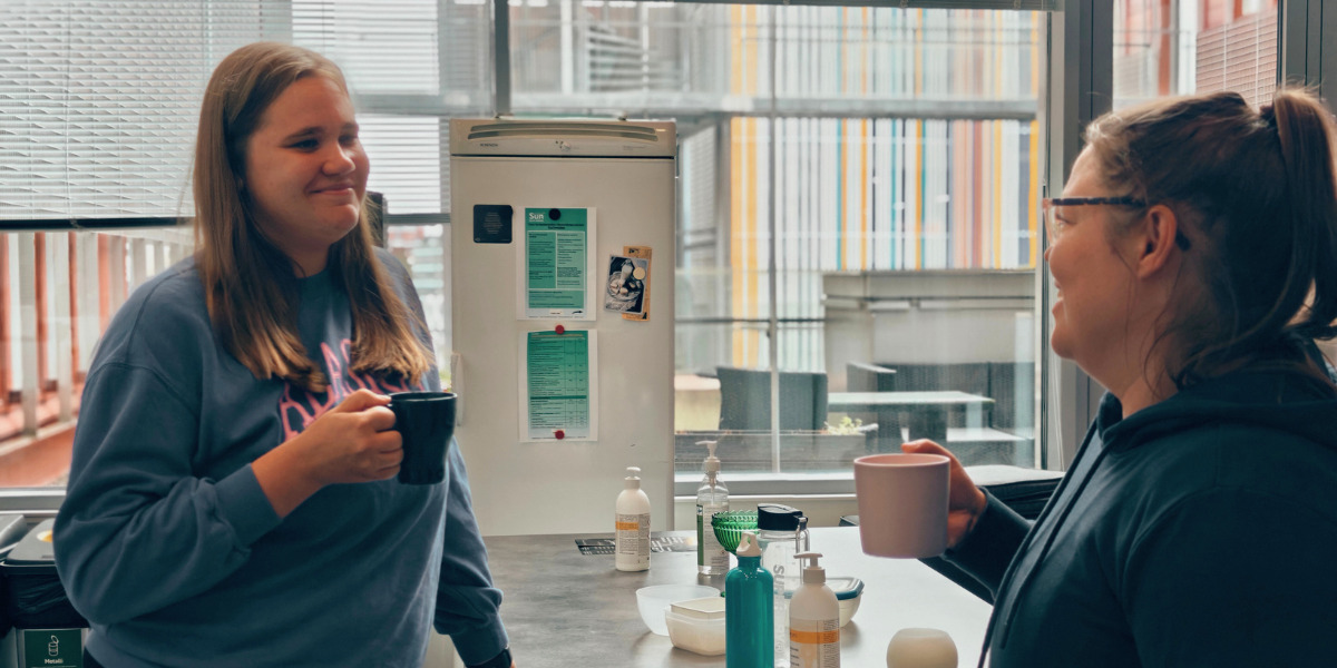 Kaksi henkilöä keskustelee kahvikupit kädessä pöydän äärellä, taustalla jääkaappi. Suvi ja sekä Kotiäitiluotsissa työskentelevä Humakin lehtori kahvitauolla Turun TKI-keskuksessa ennen hankkeen luotsien tapaamista. Kuva: Jarmo Röksä.