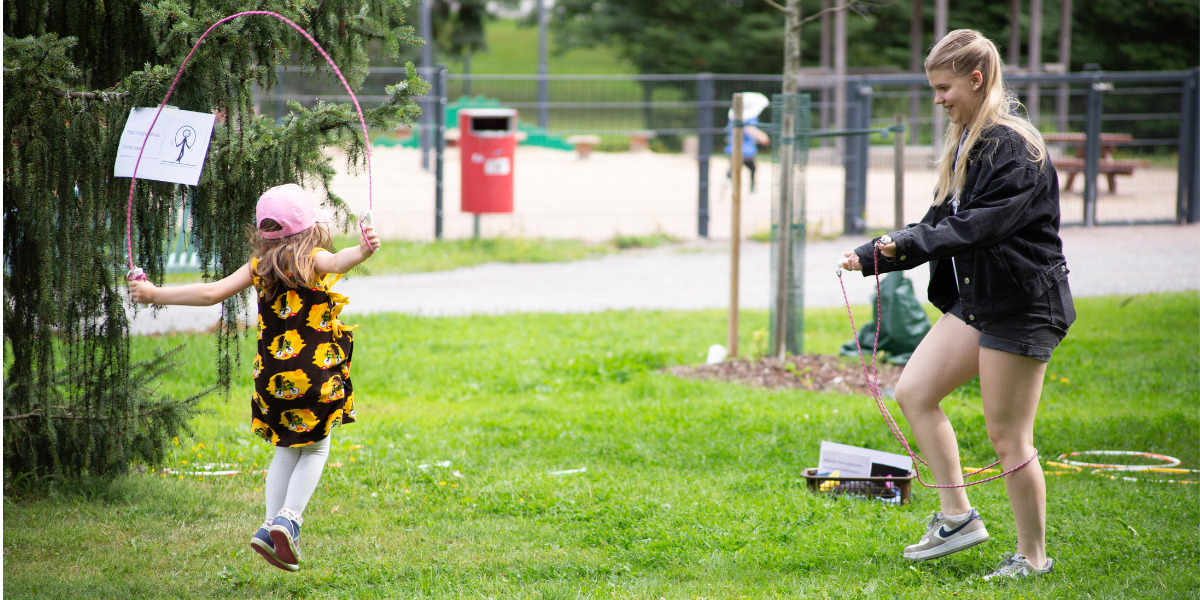 Vasemmalla lapsi hyppii hyppynarulla ja oikealla vanhempi ohjaaja hyppimässä hyppynarulla puistossa. Tuuli oli mukana elokuussa Turun Kupittaanpuistoon suuren osallistujamäärän keränneen perhepiknikin tuotannossa. Kuva: Emilia Reponen.