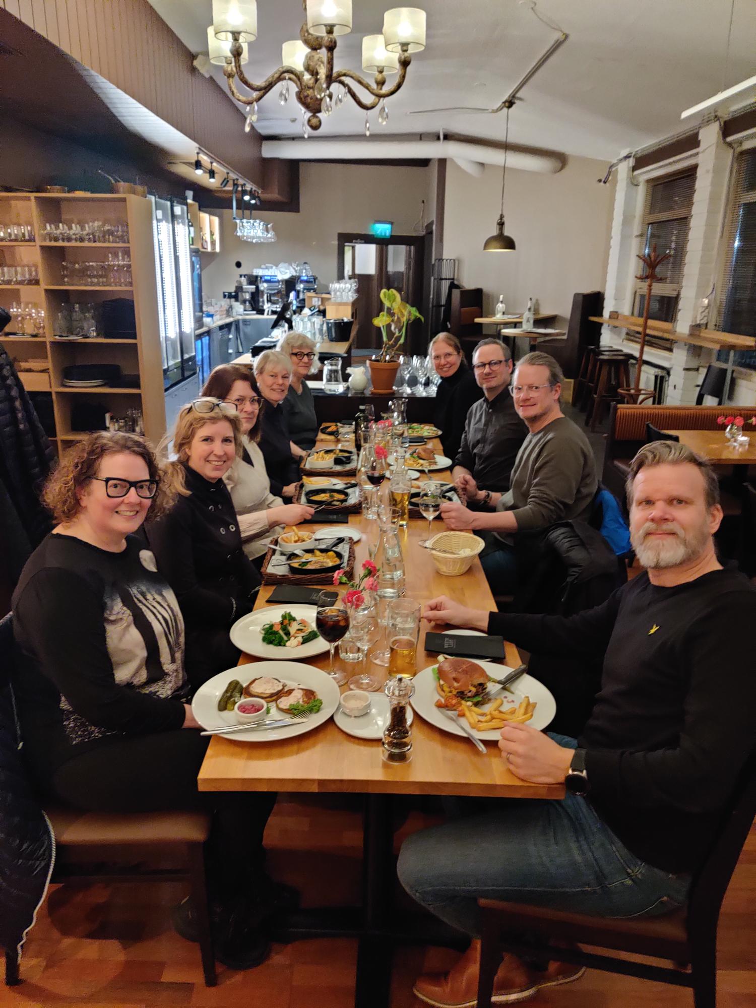Nio leende personer sitter vid restaurang bord i trä med maten serverad på tallrikar. Middag på restaurang White Lady. Från vänster, Hannaliisa, Elin, Eira, Malin, Katrin, Outi, Krister, Jonas och Magnus.