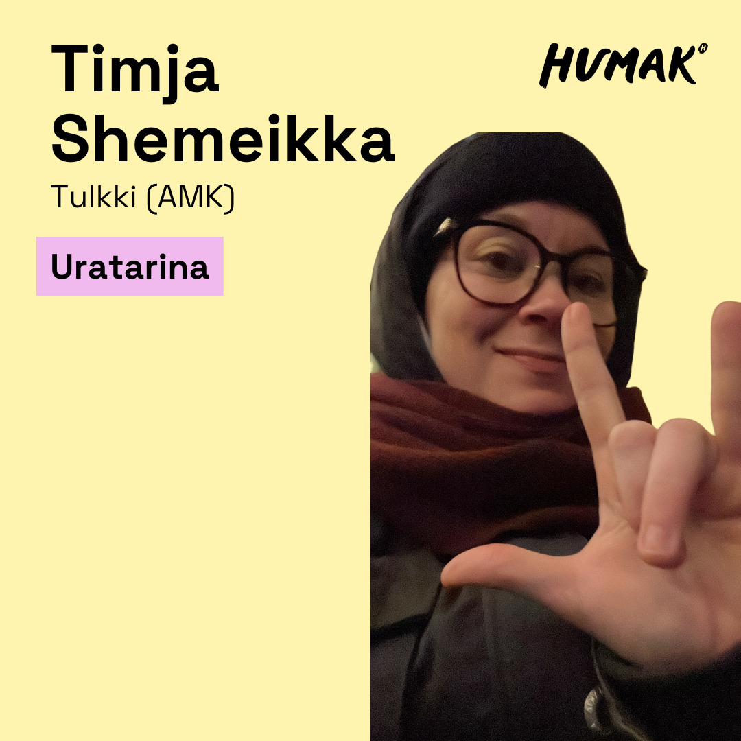 Timja Shemeikka valmistui Helsingin kampukselta Viittomakielen tulkki (AMK) -opinnoista vuonna 2011. Neljän vuoden opintojen jälkeen työllistymistilanne näytti hyvältä 一 oli työntekijän markkinat Alaan liittyvät Kelan kilpailutukset vaikuttavat kuitenkin työllistymiseen. Timja on hankkinut valmistumisensa jälkeen pätevyydet myös kirjoitus- ja oikeustulkkaukseen. Nykyisin hänellä on vakituinen työpaikka yrityksessä, jossa työkalenterin täyttymiseen pääsee vaikuttamaan vähän kuin freelancer.