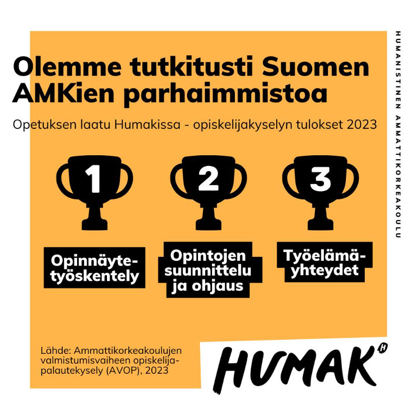 Humak on ammattikorkeakoulujen parhaimmistoa opinnäytetöissä, opintojen ohjauksessa ja työelämäyhteyksissä. Kyselyihin vastaaminen nostaa koulutuksen laatua. Opiskelijat vastaavat vuosittain loka-marraskuussa AVOP-kyselyyn. Viimeksi tehdyn perusteella olemme amkien parhaimmistoa monella osa-alueella. Opetuksen laadun kehittämisessä ollaan voitu hyödyntää mm. uraseurantakyselyiden vastauksia.
