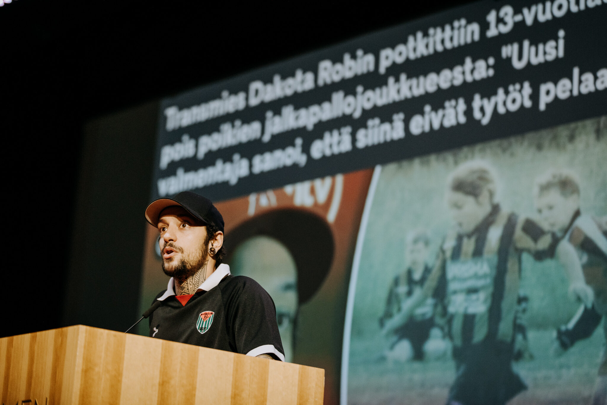 Kuvassa lippalakkinen ja parrakas henkilö puisessa puhujanpöntössä. Taustalla heijastettu kuva, jossa urheilevia nuoria. Dakota Robin kertoi koskettavan tarinan elämästään urheiluseurassa. Elämä muuttui, kun hänelle ei löytynyt paikkaa enää urheiluseurassa. Vaikeuksien jälkeen Dakotan omat tuntemukset ja hänen äitinsä sanat käänsivät tien parempaan. Hankkeen päätösseminaari järjestettiin yhteistyökumppani Hanasaaren-Hanaholmen -tiloissa. Kuva: Mari Waegelein.