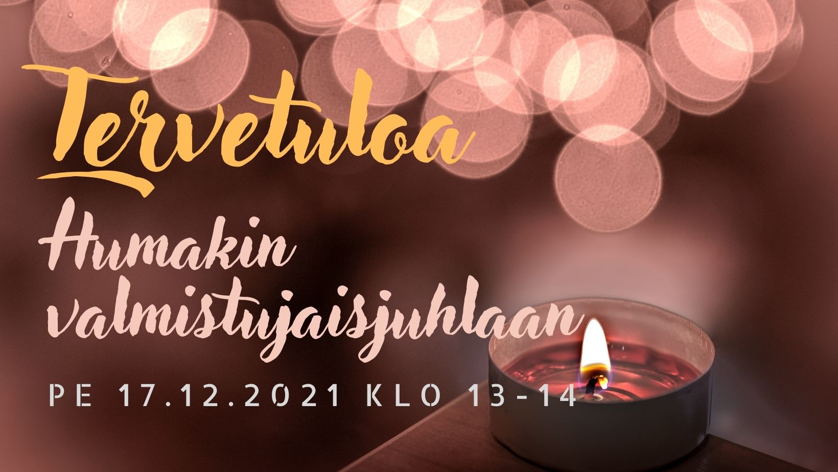 Joulun alla vietämme Humakin loppuvuoden valmistujaisjuhlaa. Verkossa järjestettävä juhla on seurattavissa youtubessa perjantaina 17.12.2021 kello 13.00-14.00.