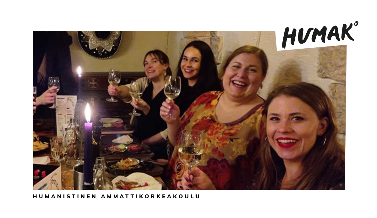 Jenni Stubbe, Danielle Aittomäki, Tiina Laine ja Minna Nikander opiskelevat yhteisöpedagogiksi YP-MOVE-koulutuksessa. Järjestö- ja nuorisotyöalankoulutus toteutetaan kokonaan verkossa. Verkossa opiskelu ei kuitenkaan tarkoita yksin opiskelua, sillä opiskelijoita kannustetaan ja innostetaan tapaamaan toisiaan myös livenä. Neljä naista ruoasta notkuvan ravintolapöydän ääressä kilistää lasejaan.