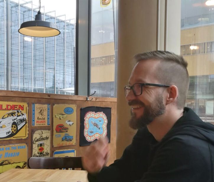 Sisuprofiilikuva parrakkaasta miehestä, jolla silmälasit. Mies nauraa, ympärillä kattovalaisin, seinustalla piirroskuvia.. Iloinen yhteisöpedaogi Mika Tullila. Kuva: Jenni Tverin Mellavuo