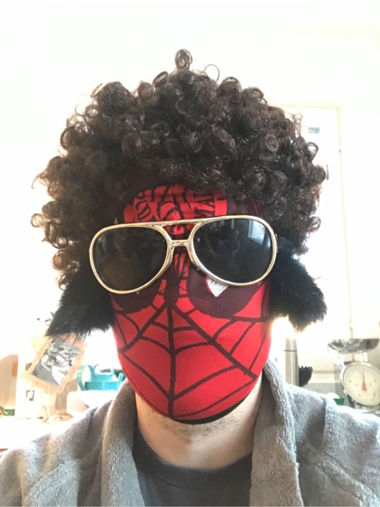 Harmaahupparinen mies, jolla punainen Spiderman naamio, isot valkosankaiset aurinkolasit, tumman ruskea, tuuhea peruukki. Spiderman-Elvis. Kuva: Mika Tullila.