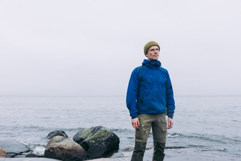 Ulkona rakennuksen edessä seisova henkilö, jolla on yllään punaiset opiskelijahaalarit, jotka ovat koristeltu haalarimerkeillä. Henkilö hymyilee ja katsoo oikealle.