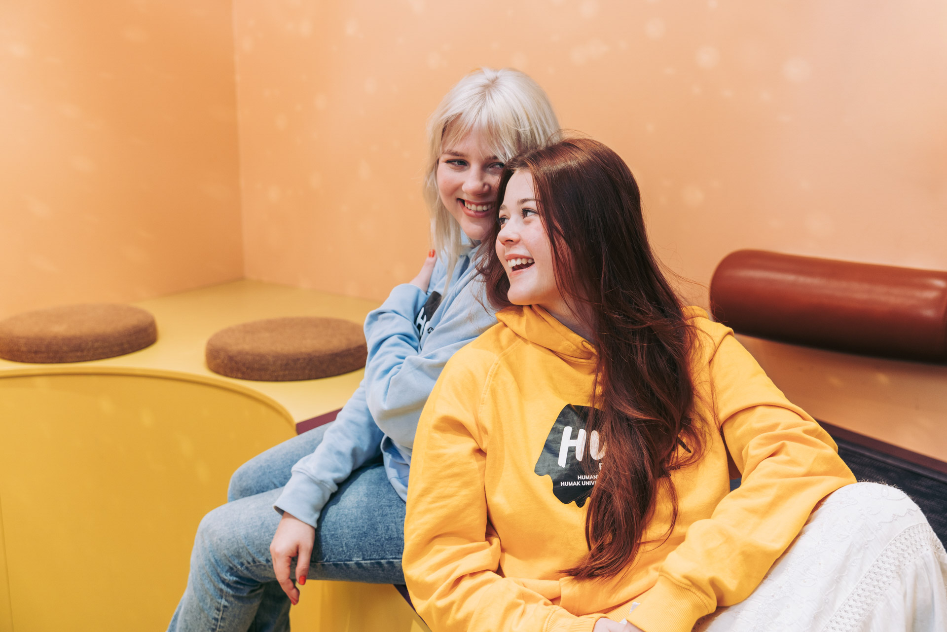 Kaksi henkilöä istuu rennosti sisätilassa värikkäiden kalusteiden keskellä ja nojaavat toisiinsa. Henkilöillä on päällään Humak-hupparit.