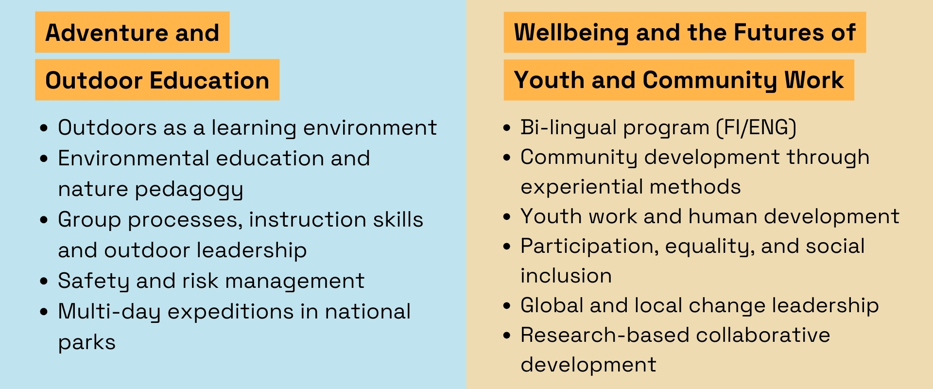 Students of Wellbeing and the Futures of Youth and Community Work will have a bilingual approach to their studies, gaining basic knowledge of Finnish during their studies. This might prove useful when applying for work in Finland. This programme is also well-suited both for international and domestic student, including immigrants living in Finland.