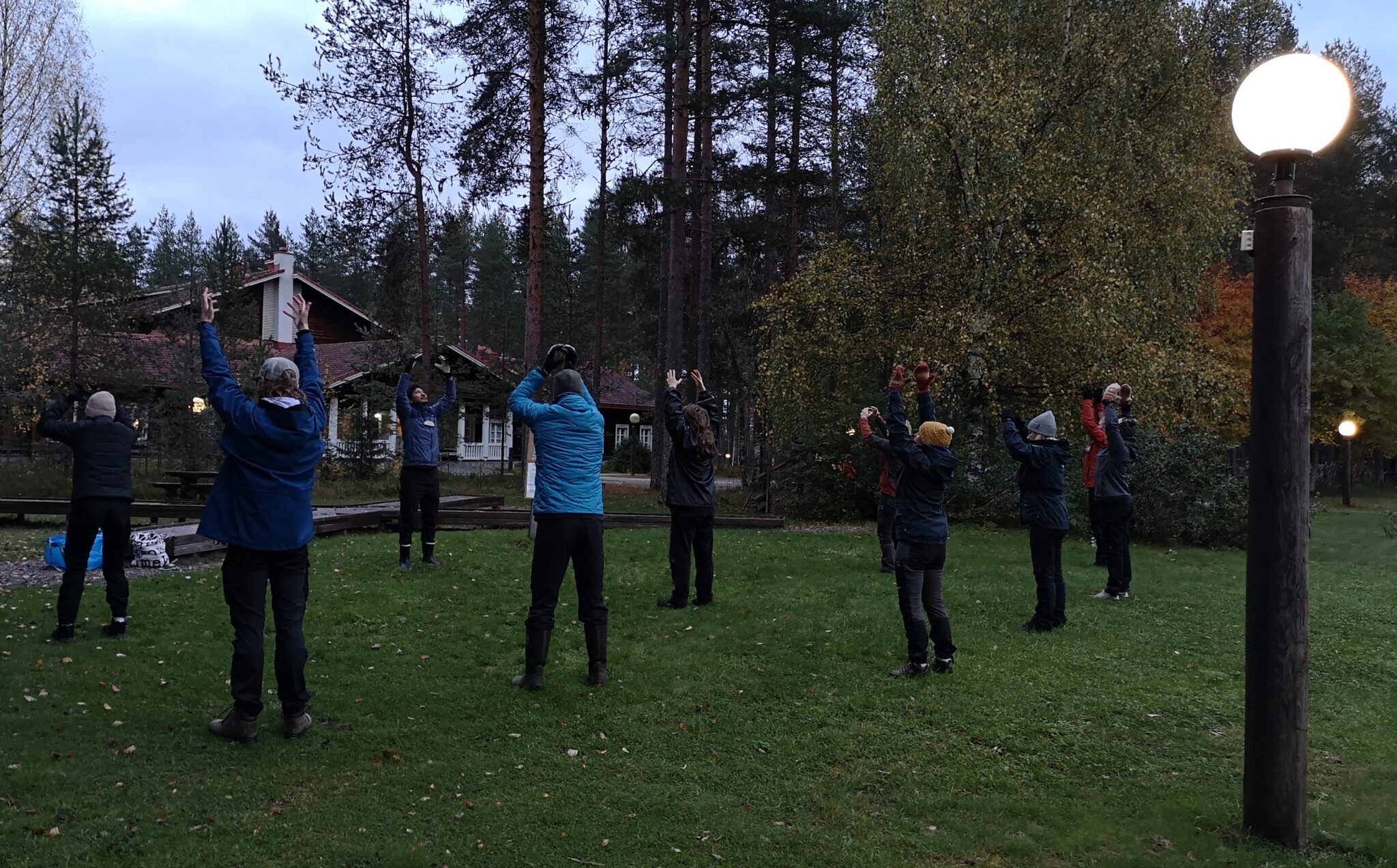 A group of people stretches on the grass in warm clothes. A physical education instructor in front. Humak 2nd year student guiding  confrence morning activity on Wednesday.