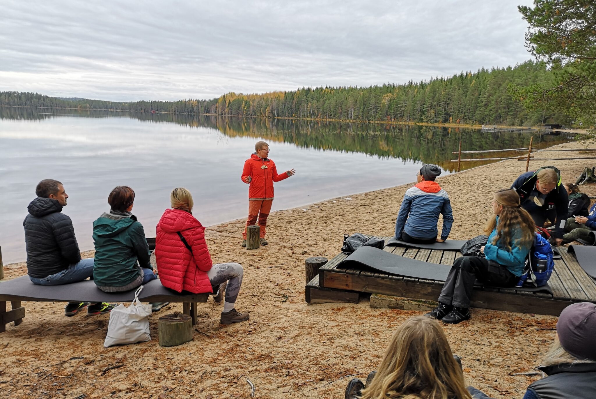 A woman dressed in a red outdoor outfit stands on the beach sand and says something to the people sitting in front of her. Lake and forest landscape in the background. Iira Tiitta’s workshop,@ilmastotiedehippi.