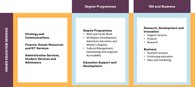 We work closely with our partners and share the common goal of developing the competence of our educational sectors. Our organisation is divided into three result areas: Higher Education Services, Degree Programmes, RDI and Business.