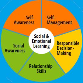 There are two circles in the figure: one big circle and one smaller circle in the middle of the bigger one. The circle in the middle says: Social and Emotional Learning. The bigger circle consists of five parts that say: Self-Awareness, Self-Management, Responsible Decision-Making, Relationship-Skills and Social Awareness. The Social and Emotional Learning Model developed by Casel.