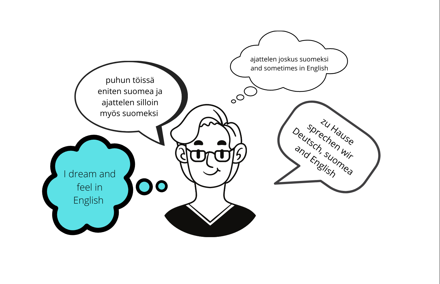 Multilingual people may have many uses and purposes for different languages, depending on the situation. Graphic design of the picture: Lena Segler-Heikkilä.