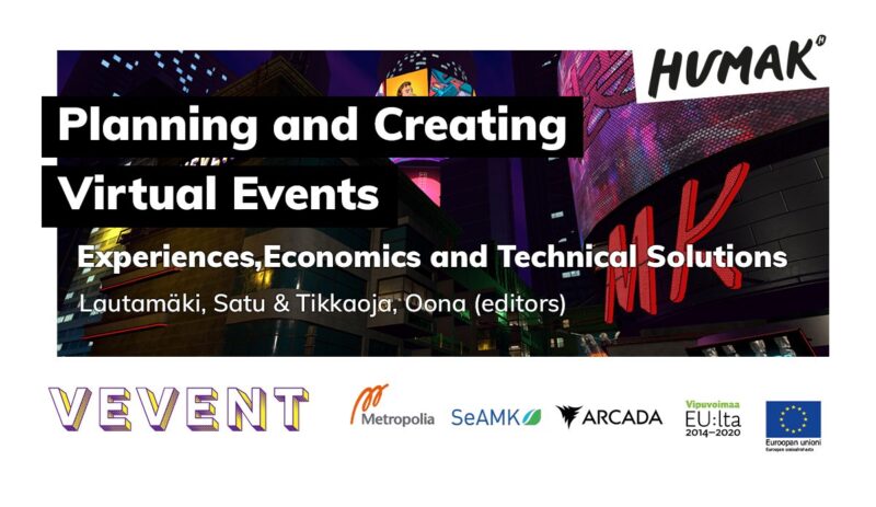 Planning and Creating Virtual Events is a practical handbook aimed to help to recognize and solve the central questions in virtual event management. It is a result of an EU project Vevent – Boosting the Virtual Event Industry, which took place 2021-2022. In the project, the participating universities of applied sciences (Arcada, Humak, Metropolia and SeAMK) conducted practical experiments on virtual event production and gathered knowledge through close discussion with experts in XR technologies and virtual event management. For that reason, this handbook offers practical tips and tricks side by side with more theoretical research.