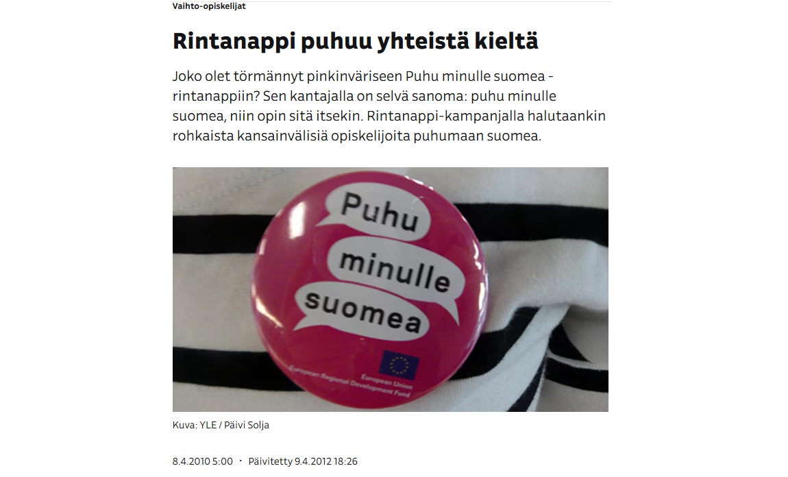 The badge of Puhu minulle suomea campaign from 15 years ago. https://yle.fi/a/3-5540400.