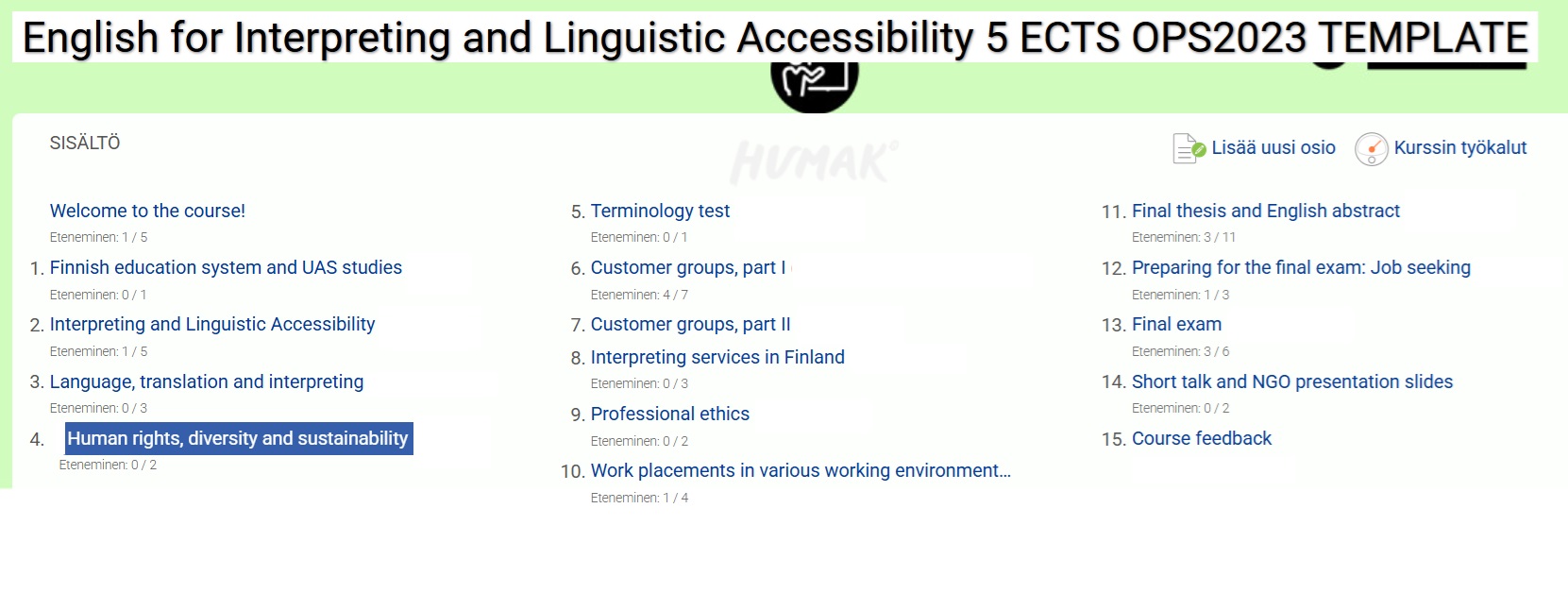 The Moodle template of the English course for the Degree Programme in Interpreting and Linguistic Accessibility: Section 4 – Human rights, diversity and sustainability.