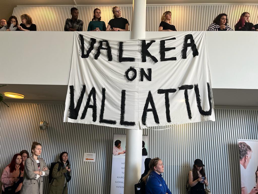 Kuvassa opiskelijoita rakennuksessa ja banderolli Valkea on vallattu. Humakin Helsingin kampus vallattiin 28.9.2023. Kuva: Kari Keuru.