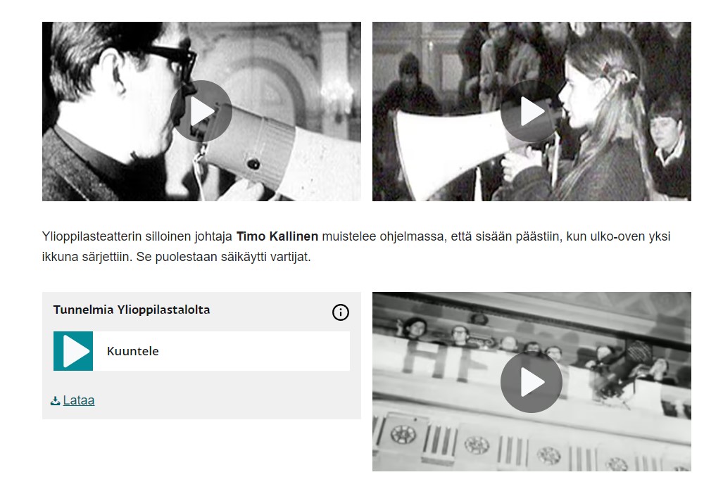 Nuoria megafonin kanssa, ruutukaappaus YLEN sivuilta. Lisäksi muistoja vanhan valtauksesta, kuuntelulinkkejä. Vanhan valtaus vuonna 1969 oli sukupolvikokemus. Ruutukaappaus YLE-arkiston sivuilta.