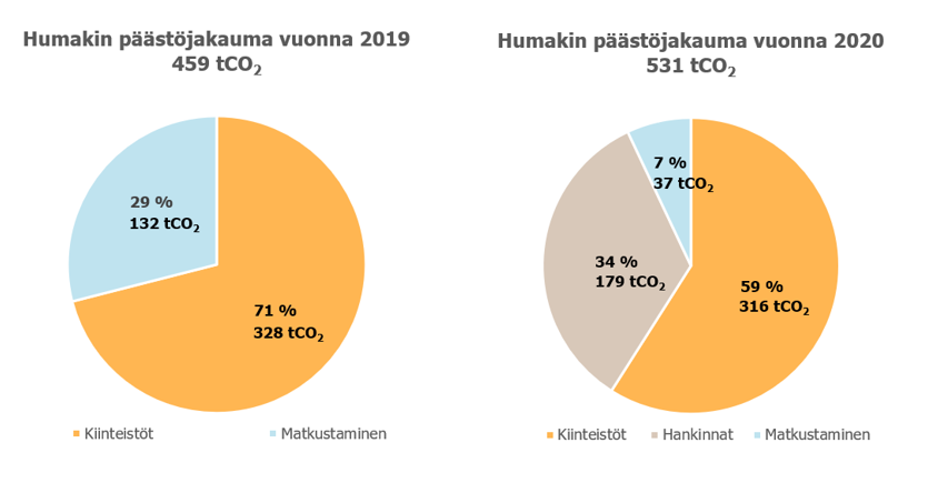 Humakin hiilijalanjälkeä on laskettu vuosina 2019 ja 2020 (ks. kuvio 1). Vuodet eivät ole täysin vertailukelpoisia erilaisesta laskentatavasta johtuen – vuonna 2020 laskennassa huomioitiin myös hankintojen päästöt, mikä selittää selvän nousun päästömäärissä. Jos jätämme huomioimatta vuoden 2020 laskennasta hankinnat, hiilipäästömme vähenivät 23 prosenttia suhteessa edelliseen vuoteen verrattuna. Huomattavin päästövähennys tapahtui matkustamisessa. Vuonna 2019 matkustamisen osuus kokonaishiilidioksidipäästöistä oli 29 prosenttia, kun vuonna 2020 koronarajoitusten ollessa pahimmillaan, se oli vain 10 prosenttia, kun hankintojen päästöjä ei huomioida laskennassa.