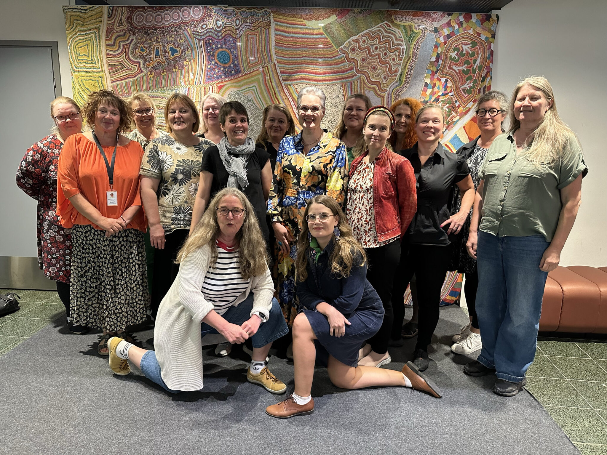 16 kappaletta Humakin työntekijöitä poseeraa värikkään seinämaalauksen edessä. He ovat ryhmittyneet kolmeen riviin ja katsovat kameraan. Työpajapäivän osallistujat antoisan päivän päätteeksi. Hanketta luotsaavat projektipäällikkö-kehittäjä Jenny Honka (toisessa rivissä kolmas oikealta) ja lehtori-kehittäjä Anniina Aunola (takarivissä keskellä).