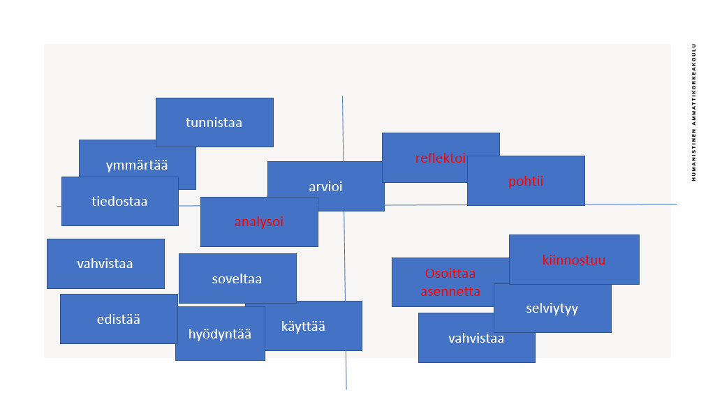 Kuvassa on viisitoista laatikkoa, joissa kussakin on yksi sana. Sanat ovat tunnistaa, ymmärtää, tiedostaa, vahvistaa, edistää, soveltaa, käyttää, hyödyntää, arvioi, selviytyy, vahvistaa, analysoi, reflektoi pohtii osoittaa asennetta ja kiinnostuu. Viisi viimeistä on kirjoitettu punaisella. Kuvaan on koottu Humakin voimassa olevasta opetussuunnitelmasta osaamista kuvailevia sanoja. Pohjana on käytetty Delamare & Wintertonin (2005) jäsennysmallia.