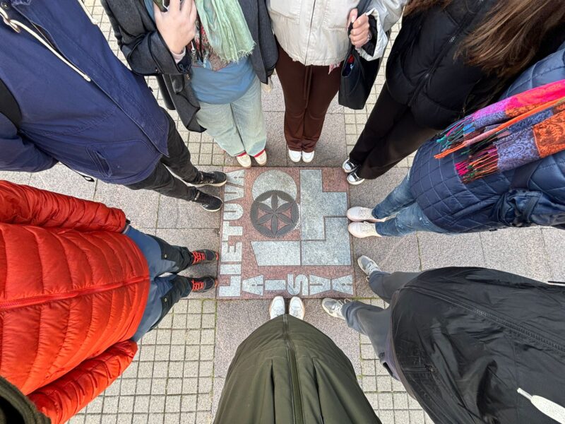FATE- hankkeen toimijoiden vartalot yhteiskuvassa Liettuan Vilnan TSM- tapaamisessa maassa olevan Laisva Lietuva laatan ympärillä. Kuva: FATE- hanke.