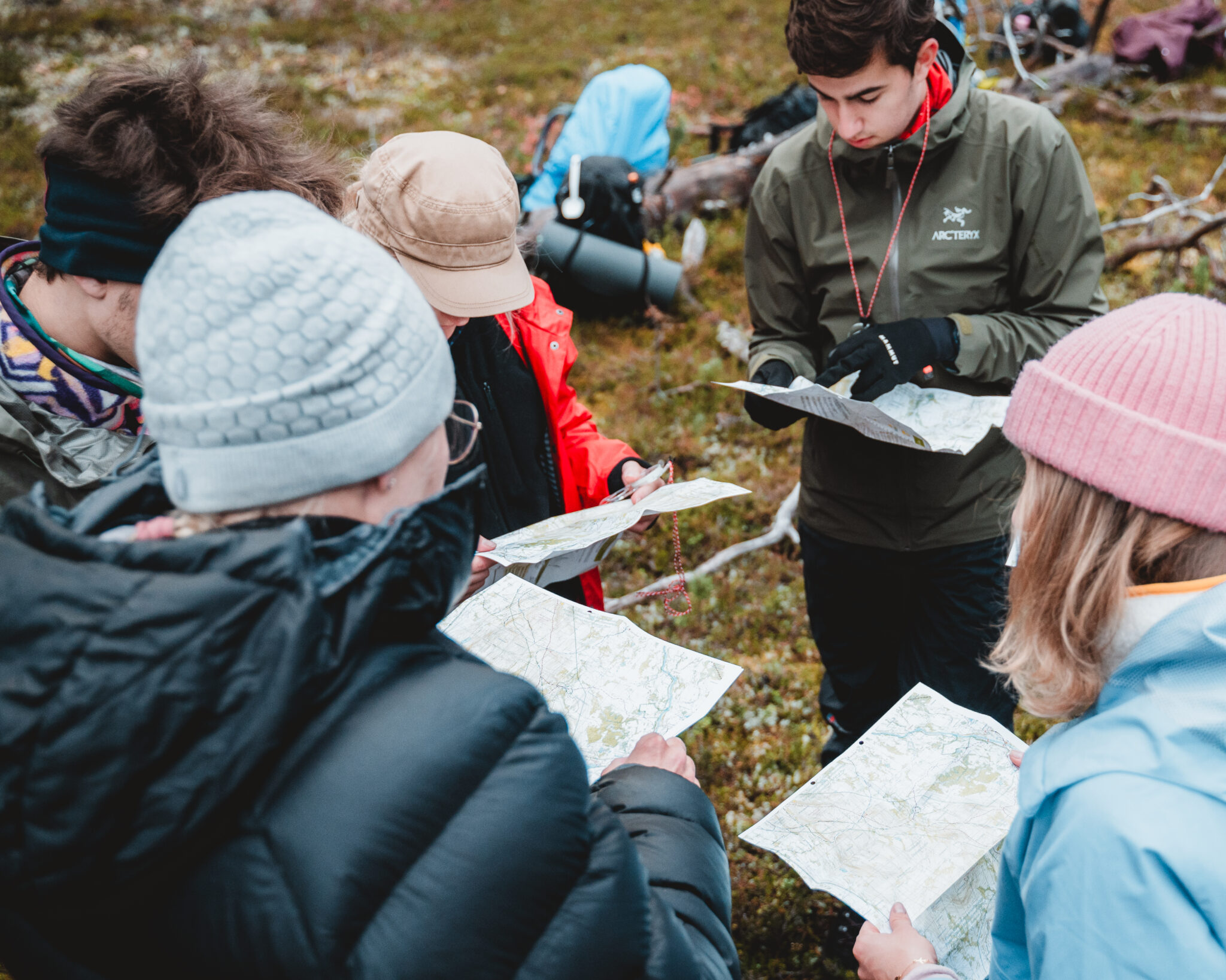Humakin seikkailukasvatuksen opiskelijat pohtivat yhdessä reittiä karttojen kanssa vaelluksella Ylläksellä. Kuva: Sanni Hydén