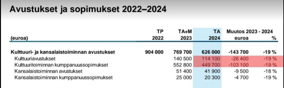 Kulttuuriavustusten ja kumppanuussopimusten leikkauksia.