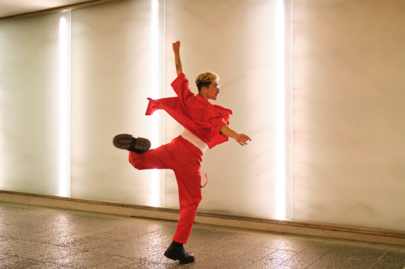 Henkilö tanssii liikkeessä kirkkaasti valaistussa käytävässä, pukeutuneena kirkkaanpunaiseen asuun ja mustiin kenkiin. Taustalla vaalea seinä, jossa on pystysuuntaiset valopaneelit. Kuvituskuva: Istock.