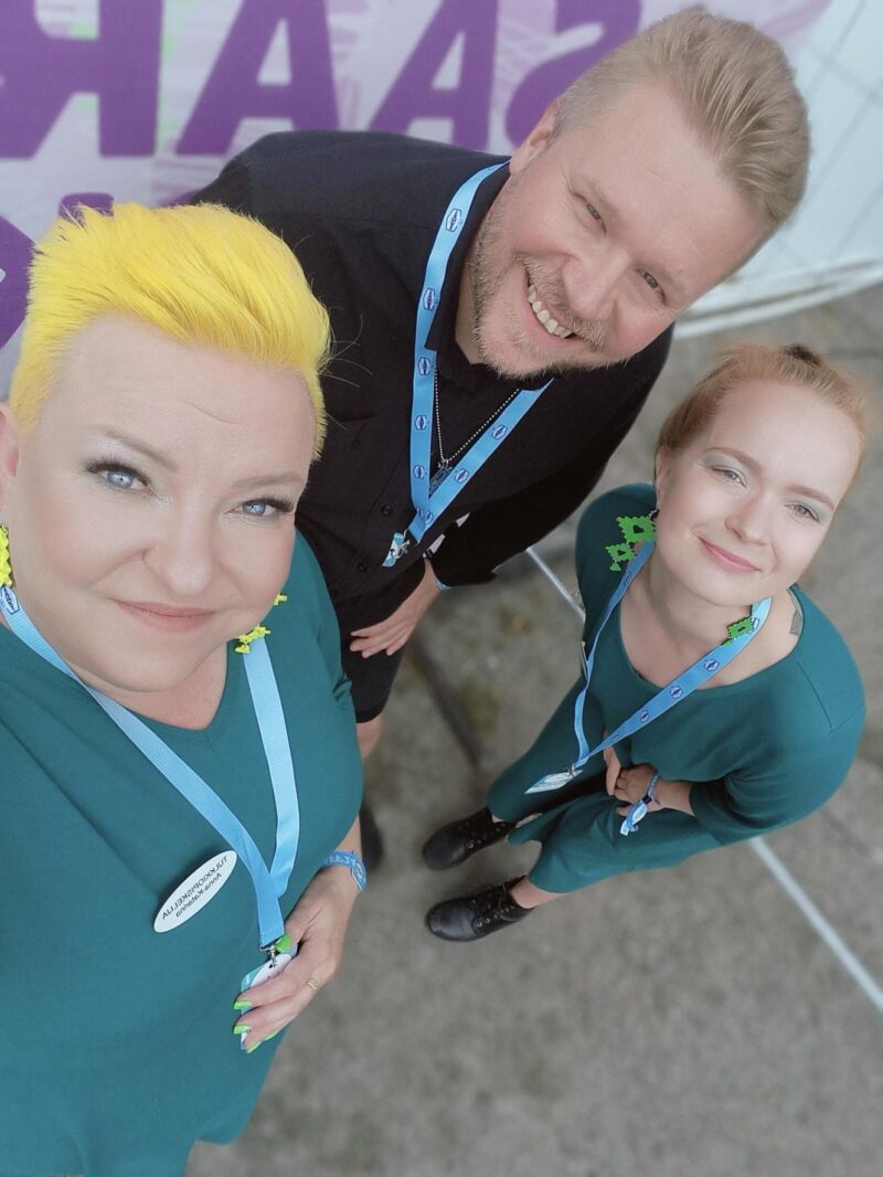 Kuvassa kolme henkilöä yläetukulmasta kuvattuna. Keskellä ylhäällä olevalla miehellä musta paita, kahdella naisella hänen molemmin puolin turkoosit mekot. Kaikki hymyilevät ja katsovat kameraan. Kuvassa juuri ennen ensimmäistä juontoa juontaja Tuomas Pippola, tulkit Anna-Katarina Kokko ja Emmi Markkanen. Tulkkien vaatteet KudeDesing, korut Korukarelia.