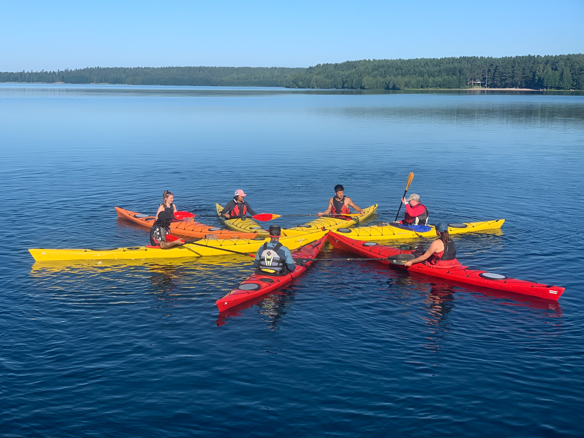 Seitsemän ihmistä järvellä kajakeissa, kasvot vastakkain muodostaen tähden muotoisen kuvion. Järvi on tyyni ja taustalla vihreää metsää. Lähiopetus ja pedagogisten taitojen harjoittelu pienryhmissä ovat keskeinen osa seikkailukasvatuksen opintoja. Kuva: Sini Lahti.