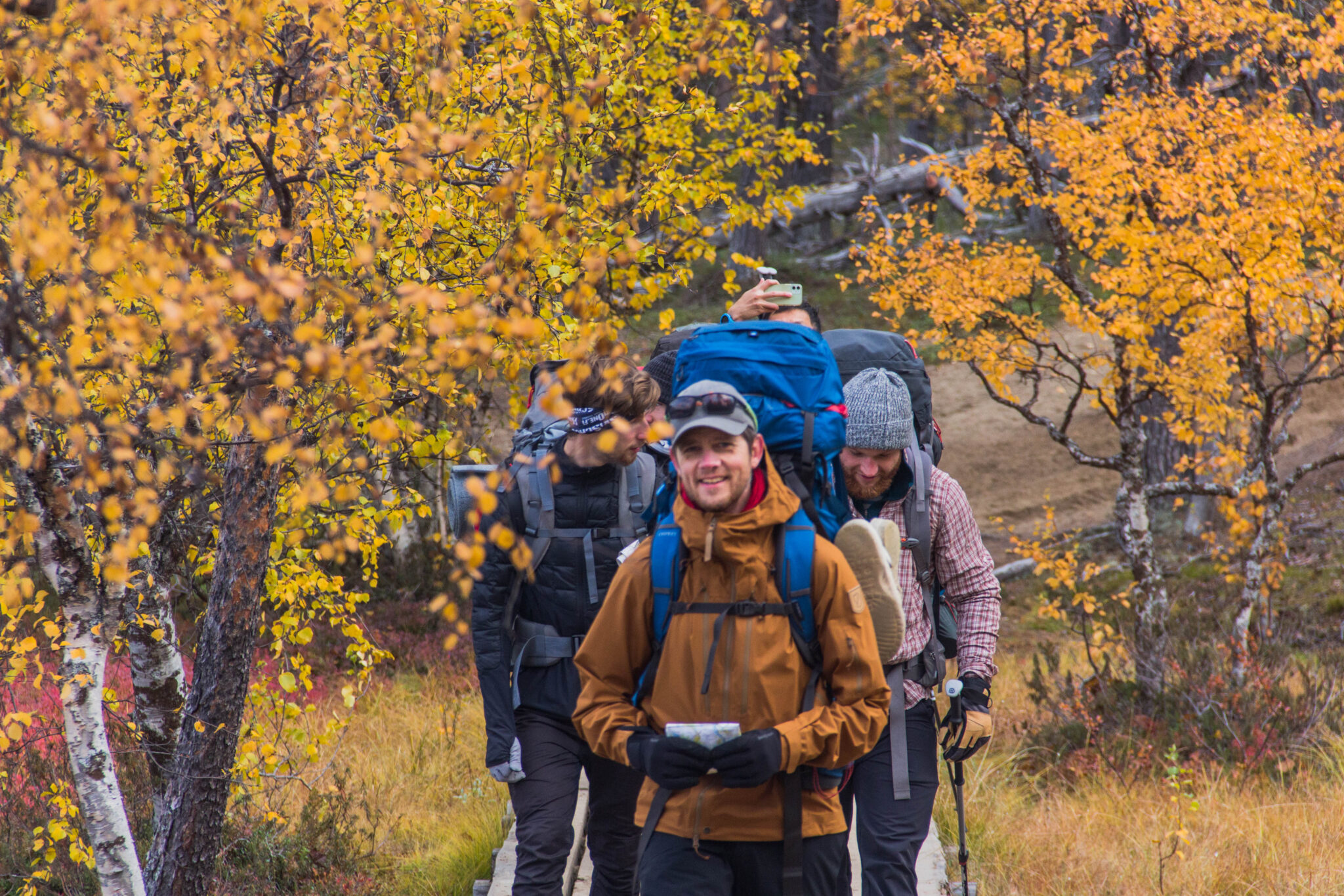 Kolme miestä kävelee pitkospuilla kameraa kohti, yllään vaellusvaatteet ja reput. He ylittävät kosteikkoa, ympärillä keltalehtisiä hieskoivuja. Seikkailukasvatuksen opiskelijat syysvaelluksella Lapissa. Kuva: Rupak Maharjan.