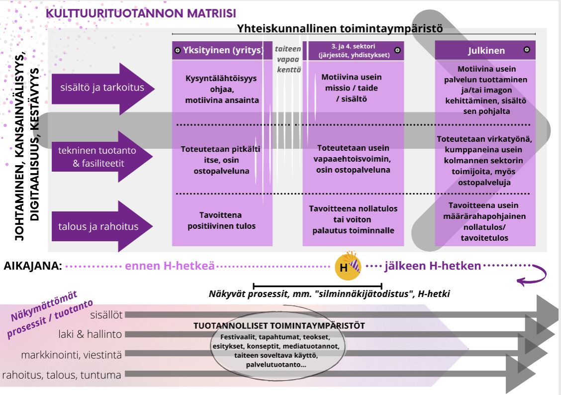 Kulttuurituotannon matriisi tiivistää erilaiset tuotantoympäristöt ja kulttuurituotannon perusprosessit. Matriisin laatijat: Jari Hoffrén ja Johanna Muhonen.