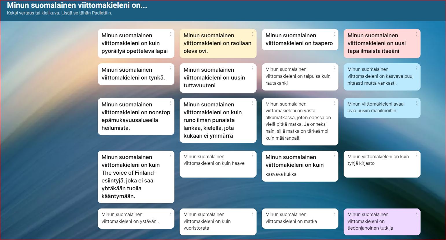 Opiskelijat ovat tässä opintojaksossa tehneet harjoituksen, jossa tehtävänä on jatkaa lauseita: ”Minun suomen kieleni on…” ja ”Minun suomalainen viittomakieleni on…” Syntyi monenlaisia vertauksia ja kielikuvia. Tässä julkaistaan ensimmäisen vuoden opiskelijoiden viittomakielen opiskeluun liittyviä ajatuksia eri vuosikurssien vastauksista koostettuna.