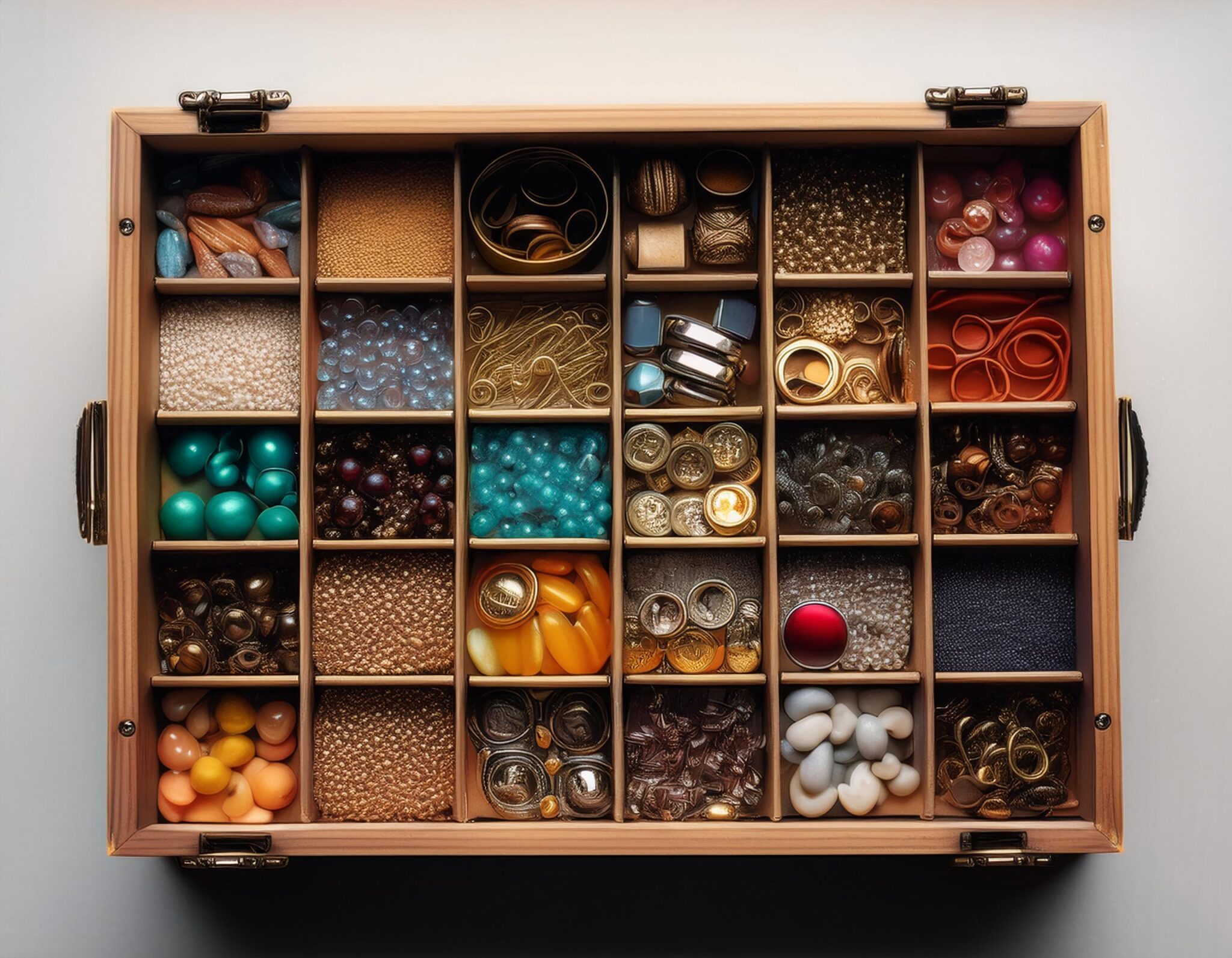 Kuvassa on kanneton, neliskanttinen laatikko, joka jakautuu tasamittaisiin pienempiin laatikoihin. Laatikko on pöydällä. Jokaisessa laatikossa on lajitellusti erilaisia ja erivärisiä pieniä asioita esim. korukiviä. Pääsääntöisesti pienissä laatikoissa on keskenään samankaltaisia pieniä esineitä, mutta joissakin laatikoissa on useampia, keskenään erilaisia esineitä. Kuva on valokuvamainen. Kuvituskuva. Kuva: Adobe Firefly/ Niina Autiomäki.
