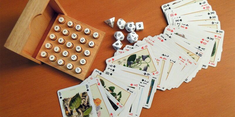 Blogi Nuorisotyöntekijästä pelikasvattajaksi: Hajallaan oleva korttipakka, jonka vieressä on erimuotoisia noppia ja puinen yksinpelattava lautapeli. Perinteiset pelit kiinnostavat yhä.