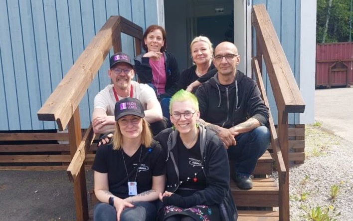 Kuvassa Nuorisotyöpaja Tuuman ohjaajia ja hankkeen asiantuntija viimeisen valmennuspajan jälkeen. Alhaalla vasemmalla ohjaajat Saara Lindholm ja Arni Oksanen, keskellä ohjaajat Janne Järvelä ja Jukka Törn, ylhäällä ohjaaja Eeva Kiukas ja lehtori Sari Huttu.