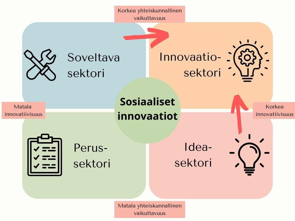 – “Sosiaalinen innovaatio on uusi, yksilöiden tai yhteisöjen hyvinvointia tai toimintakykyä tai yhteiskunnallista hyvinvointia edistävä idea, tuote, palvelu tai toimintamalli, joka on luotu yhteistyössä eri sidosryhmien kanssa ja jonka tavoitteena on vastata erilaisiin, pääasiassa sosiaalisiin haasteisiin uudella ja innovatiivisella tavalla. Sosiaalinen innovaatio yhdistää luovasti eri alojen osaamista ja hyödyntää uusia tai olemassa olevia resursseja tavalla, joka edistää osallisuutta, kestävyyttä, hyvinvointia sekä yhteisöllisyyttä, luoden samalla merkittävää yhteiskunnallista vaikuttavuutta” (Pelkonen 2023).