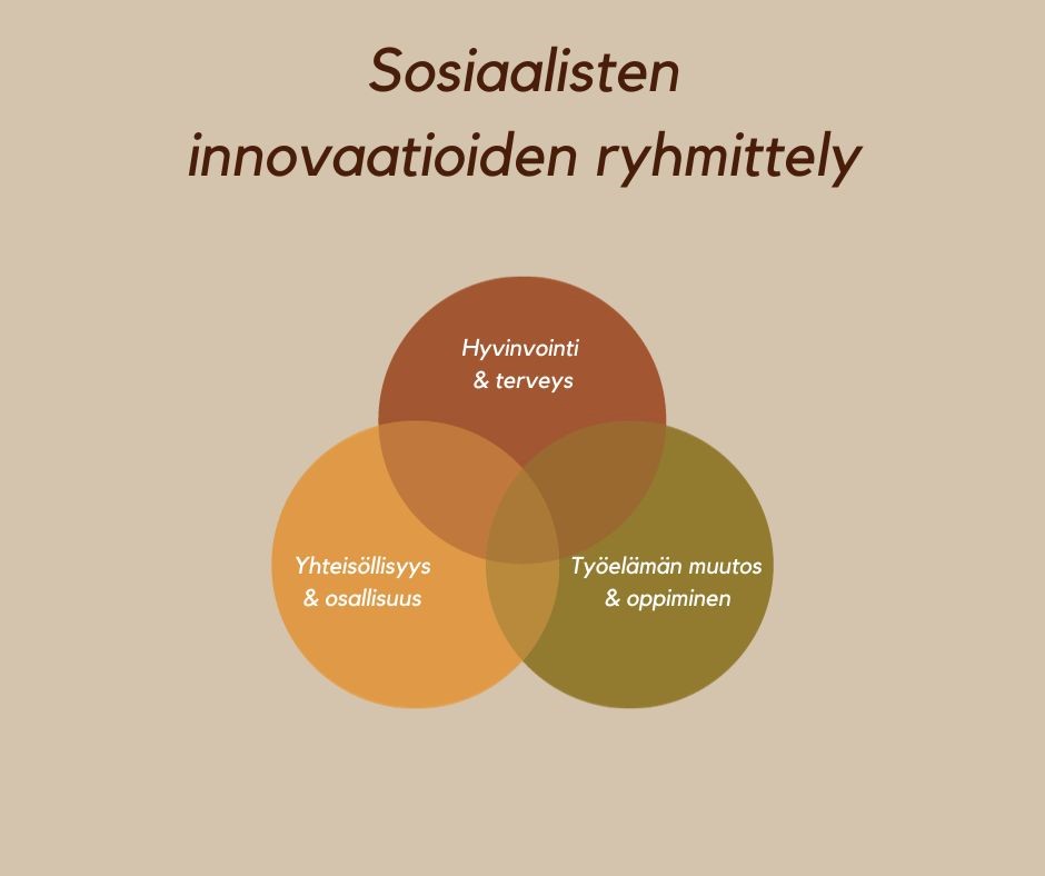 Varsinaisen systemaattisen kirjallisuuskatsauksen yhteydessä sosiaalisia innovaatioita – pieniä ja hieman suurempia – löytyi odotetusti aineiston joukosta. Sosiaaliset innovaatiot olivat keskenään erilaisia ja osin limittäisiä. Aineiston hallinnan kannalta muodostui tarve ryhmitellä innovaatioita eri ryhmiin. Ryhmittelyyn oli useita eri tapoja, joista toimivimmaksi osoittautui ryhmitteleminen hyvinvoinnin ja terveyden ryhmään, yhteisöllisyyden ja osallisuuden ryhmään sekä työelämän muutoksen ja oppimisen ryhmään. Ryhmittelyssä näkyi, että joskus sosiaaliset innovaatiot esiintyivät useassa ryhmässä samanaikaisesti.