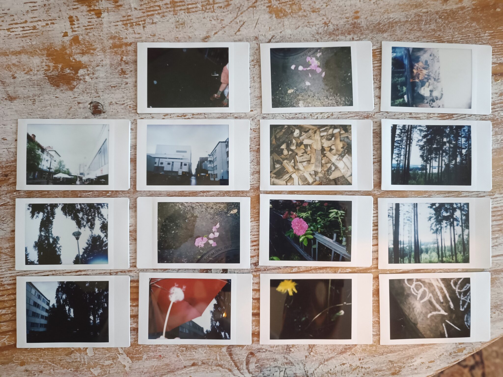 Ylhäältä otettu kuva puupinnalla järjestellyistä 16 Polaroid-tyyppisestä valokuvasta. Kuvat esittävät erilaisia aiheita, kuten kaupunkimaisemia, luontokohteita kuten puita ja kukkia, sekä abstraktimpia yksityiskohtia, kuten puupaloja ja graffiteja. Yhdessä osallisiksi – Mieliteko 2.0 -hankkeen ryhmätoiminnassa otettiin yhdessä valokuvia. Kuva: Milla Bouquerel.